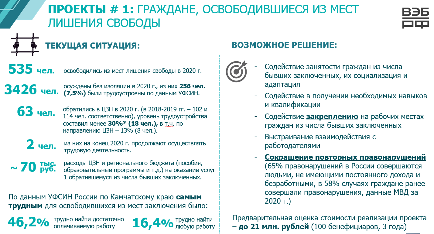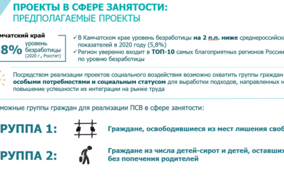 О проекте социального воздействия в сфере занятости, планируемого к реализации в Камчатском крае, сообщила министр труда и развития кадрового потенциала Камчатского края Наталья Ниценко. В качестве социальных бенефициаров согласно проекту предложено определить граждан, освободившихся из мест лишения свободы, и детей-сирот. Выбор данных категорий обусловлен крайне низкой мотивацией к трудоустройству и слабой закрепляемостью на рабочих местах.