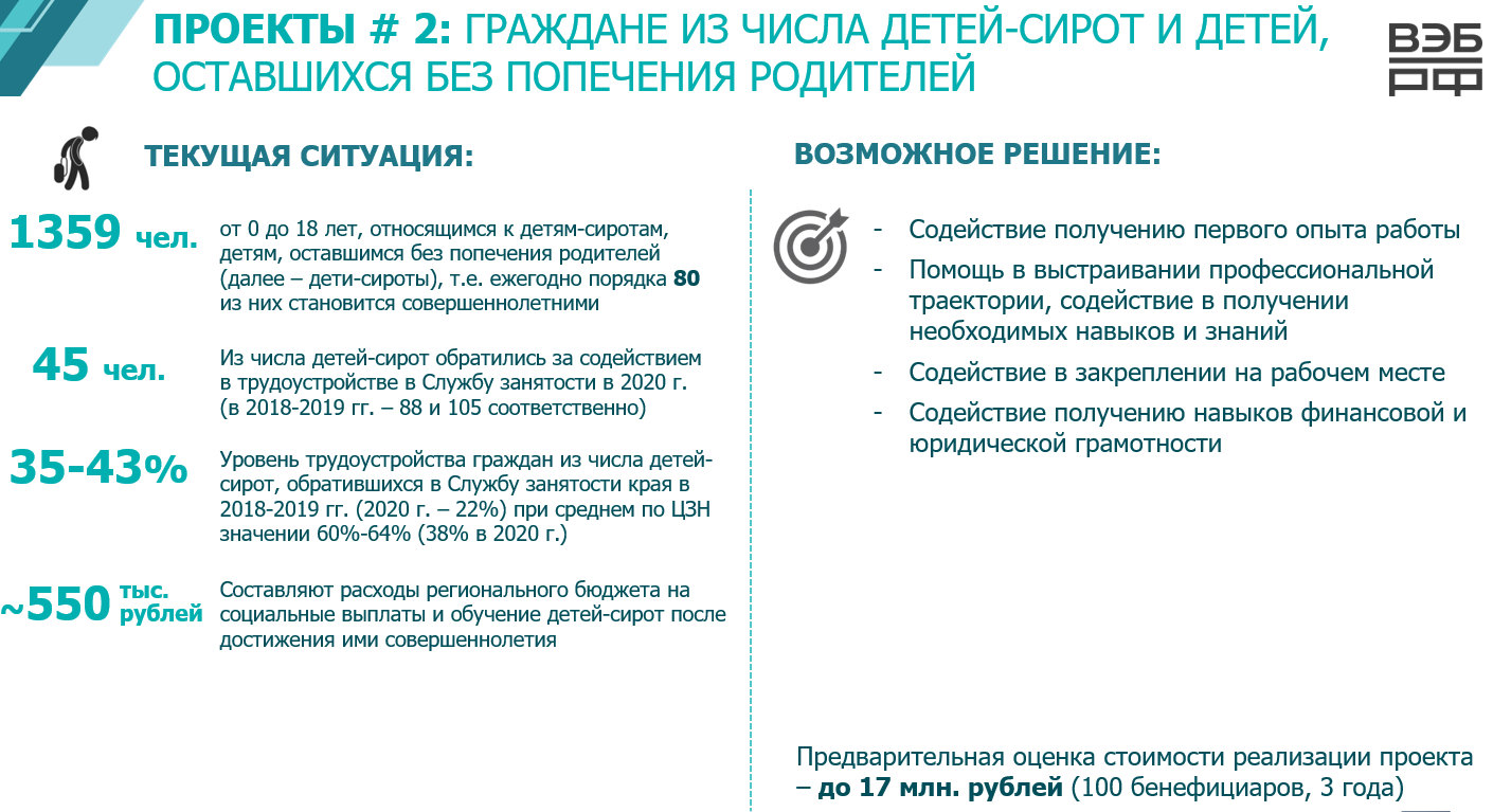 С учетом вышеизложенного по итогам заседания предложено реализовать для данных категорий граждан проект социального воздействия. Министерству труда и развития кадрового потенциала Камчатского края совместно с ВЭБ.РФ поручено разработать проект плана мероприятий («дорожной карты») по разработке и реализации в Камчатском крае проекта в сфере занятости.